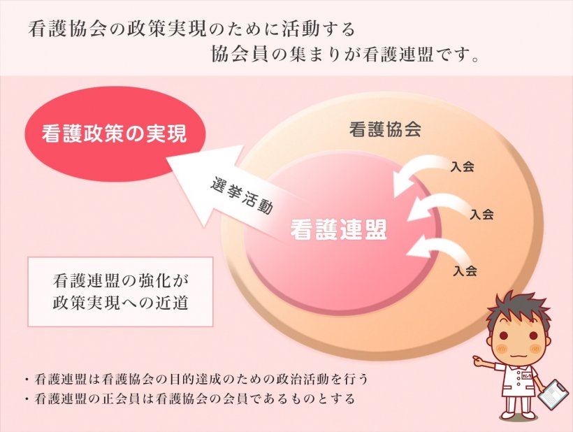 看護連盟とは 看護連盟の誕生 日本看護連盟は、社団法人日本看護協会の目的を達成するための政治団体として、昭和34年(1959年)に誕生しました。 滋賀県看護連盟は昭和35年(1960年)に、日本看護連盟滋賀県支部として設立されました。平成17年度(2007年)日本看護連盟総会において、都道府県支部から都道府県看護連盟に組織が改正され、滋賀県看護連盟として新たにスタートしました。 看護連盟と看護協会 看護協会と看護連盟は役割を分担しながら、共同して活動し、問題可決を図ります。