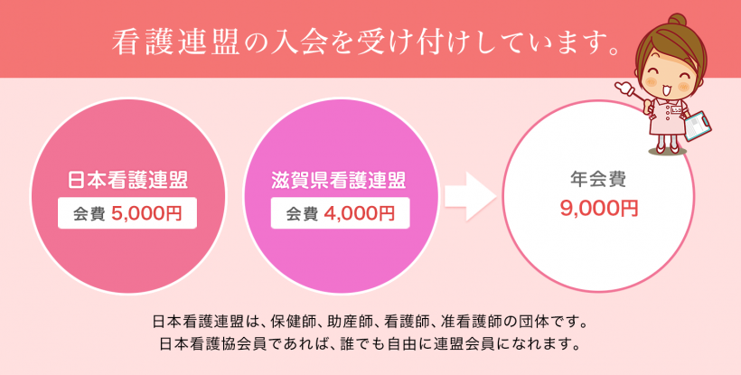 | 年会費 | 無料 ご入会いただいた方には、滋賀県看護連盟だより 「おうみ」をお届けします。 |