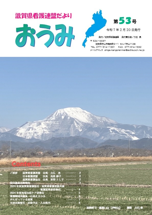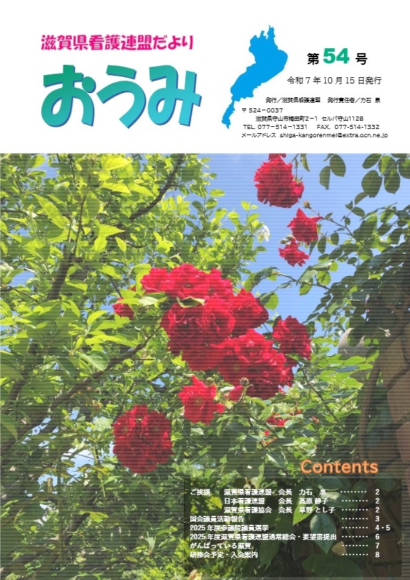 滋賀県看護連盟だより 滋賀県看護連盟だより『おうみ』第54号(2025年10月15日発行) 滋賀県看護連盟だより『おうみ』第53号(2025年2月20日発行) 滋賀県看護連盟だより『おうみ』第52号(2024年11月1日発行) 滋賀県看護連盟だより『おうみ』第51号(2024年2月10日発行) 滋賀県看護連盟だより『おうみ』第50号(2023年10月10日発行) 滋賀県看護連盟だより『滋賀』第49号(2023年1月31日発行) 滋賀県看護連盟だより『滋賀』第48号(2022年9月30日発行) 滋賀県看護連盟だより『滋賀』第47号(2022年1月31日発行) 滋賀県看護連盟だより『滋賀』第46号(2021年8月発行) 滋賀県看護連盟だより『滋賀』第45号(令和3年2月20日発行) 滋賀県看護連盟だより『滋賀』第44号(令和2年9月30日発行) 滋賀県看護連盟だより『滋賀』第43号(令和2年3月31日発行) 滋賀県看護連盟だより『滋賀』第42号(令和1年12月13日発行) 滋賀県看護連盟だより『滋賀』第41号(平成31年1月31日発行) 滋賀県看護連盟だより『滋賀』第40号(平成30年8月31日発行) 滋賀県看護連盟だより『滋賀』第39号(平成30年1月31日発行) 滋賀県看護連盟だより『滋賀』第38号(平成29年6月30日発行) 滋賀県看護連盟だより『滋賀』第37号(平成29年1月31日発行) 滋賀県看護連盟だより『滋賀』第36号(平成28年6月10日発行) 滋賀県看護連盟だより『滋賀』第35号(平成28年2月1日発行) 滋賀県看護連盟だより『滋賀』第34号(平成27年5月20日発行) 滋賀県看護連盟だより『滋賀』第33号(平成27年2月1日発行) 滋賀県看護連盟だより『滋賀』第32号(平成26年10月15日発行) 滋賀県看護連盟だより『滋賀』第31号(平成26年5月20日発行) 滋賀県看護連盟だより『滋賀』第30号(平成26年2月1日発行) 滋賀県看護連盟だより『滋賀』第29号(平成25年10月1日発行) 滋賀県看護連盟だより『滋賀』第28号(平成25年6月1日発行) 滋賀県看護連盟だより『滋賀』第27号(平成25年1月31日発行) 滋賀県看護連盟だより『滋賀』第26号(平成24年10月1日発行) 滋賀県看護連盟だより『滋賀』第25号(平成24年5月20日発行) 滋賀県看護連盟だより『滋賀』第24号(平成24年1月5日発行) 滋賀県看護連盟だより『滋賀』第23号(平成23年5月20日発行) 滋賀県看護連盟だより『滋賀』第22号(平成23年1月5日発行) 滋賀県看護連盟だより『滋賀』第21号(平成22年9月30日発行) 滋賀県看護連盟だより『滋賀』第20号(平成22年5月発行) 滋賀県看護連盟だより『滋賀』第19号(平成21年12月発行) 滋賀県看護連盟だより『滋賀』第18号(平成21年9月発行) 滋賀県看護連盟だより『滋賀』第17号(平成21年6月発行)